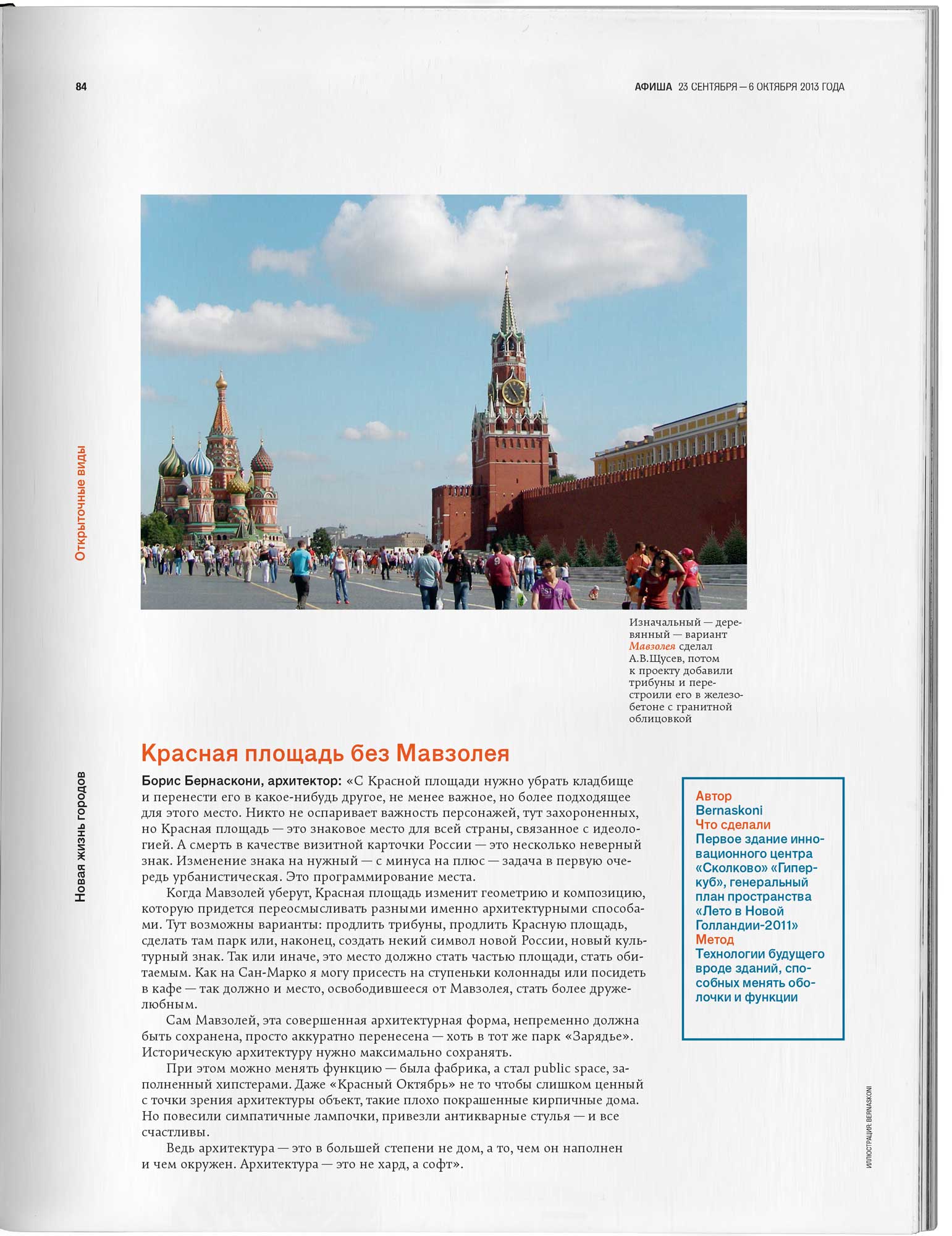 С Красной площади нужно убрать кладбище и перенести его в какое-нибудь другое, не менее важное, но более подходящее для этого место. Никто не оспаривает важность персонажей, тут захороненных, но Красная площадь — это знаковое место для всей страны, связанное с идеологией. А смерть в качестве визитной карточки России — это несколько неверный знак. Изменение знака на нужный — с минуса на плюс — задача в первую очередь урбанистическая. Это программирование места.
