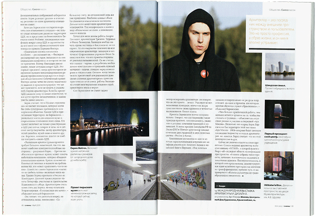Сейчас Борису больше хочется «исполнять»: «чем больше практической работы, тем меньше остается времени на то, чтобы участвовать в тусовках», — объясняет он отсутствие рвения к участию в очередной «Арх Москве». Несколько лет подряд Борис Бернаскони был куратором этой выставки. Он же занимался дизайном прошлогодней “1 Московской Биеннале Архитектуры. «Арх Москва – 2009» впервые будет целиком посвящена творчеству молодых архитекторов, но, кажется, Борис считает, что из этой категории уже вырос. Сейчас он увлечен издательскими проектами. Совсем недавно архитектор выпустил книжку “MUSEЙ”, в которой вместе с бюро «а-0» исследует область музеефикации пространства. «В книге собраны наши проекты, начиная от выставочного экспоната до здания. Последовательность, в которой они представлены, демонстрирует, как идея музейного пространства постепенно трансформируется, проходя путь от интравертного объекта-скульптуры к градообразующим элементам.