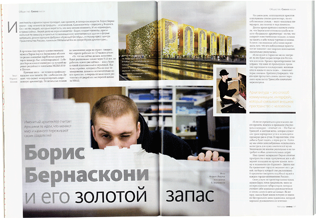 Известность к архитекторам приходит, как правило, в солидном возрасте. Борис Бернаскони – ему немного за тридцать – исключение. Не верите – спросите у Яндекса. Он из тех людей, которые верят в то, что мир можно изменить. И не «однажды», а прямо сейчас. Верой дело не ограничивается — Борис создает проекты, оригинальные по замыслу и простые по воплощению: многоэтажные здания в форме матрешек, реконструкция фабрики «Красный Октябрь», интерьер пресс-центра Правительства России, павильон IMMaterial Box во дворе Музея архитектуры…