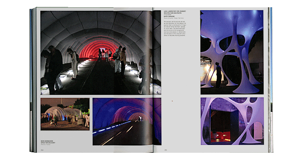 Пространство павильона членится с помощью надувных арок, формирующих оболочку, а также света и цвета.
