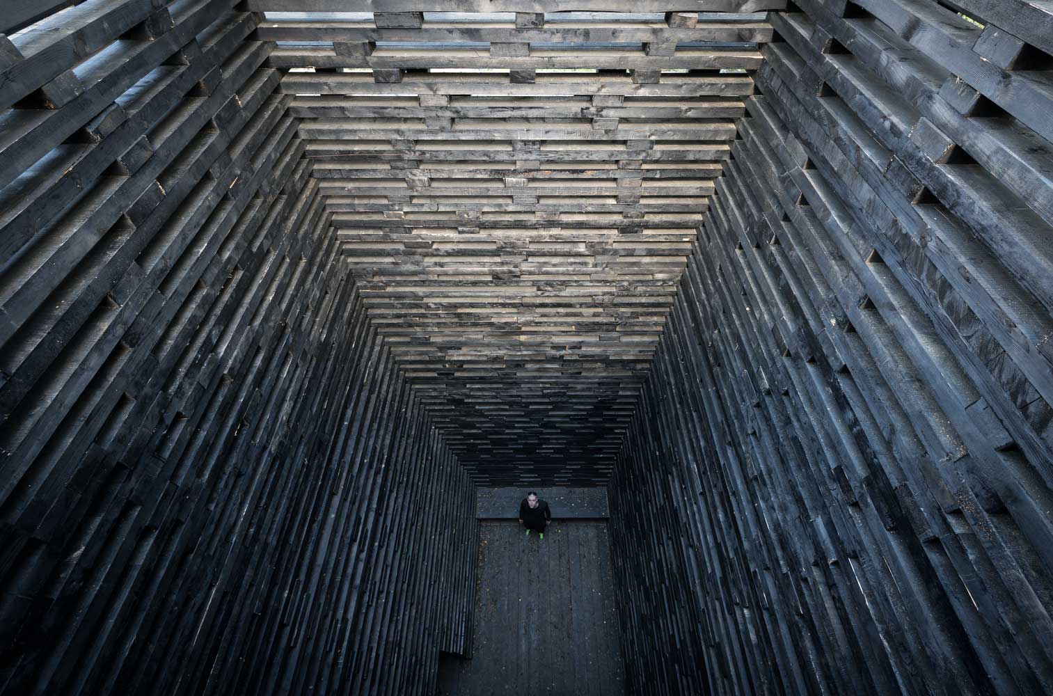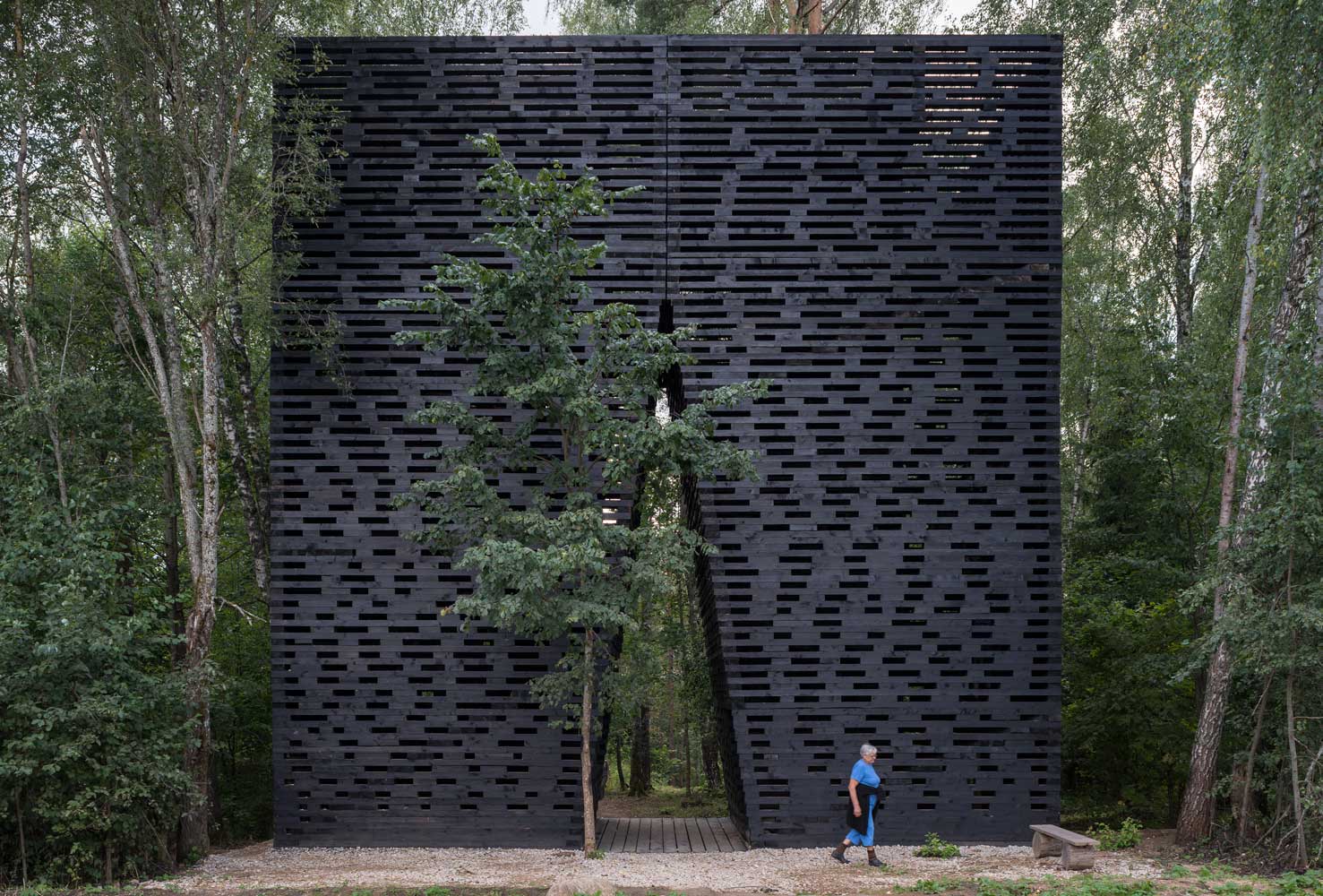 ARC is made of six-meter board according to the principles of non-waste production. All cuttings are used as structural elements. ARC has a rectangular form both on the plan and facades, the portal has an acute angle cut, construction is painted in black.